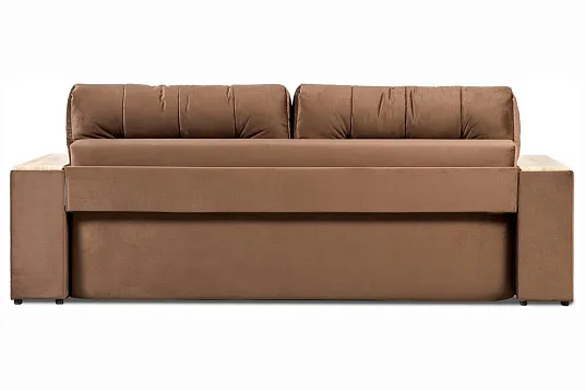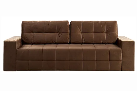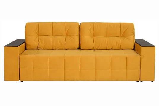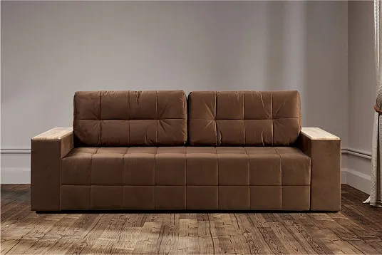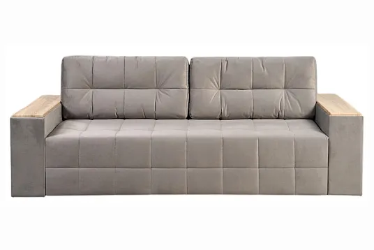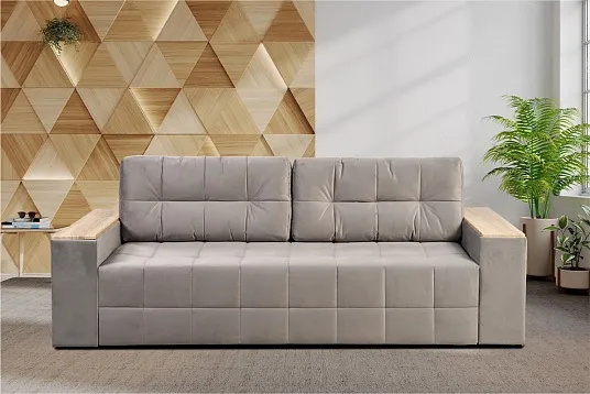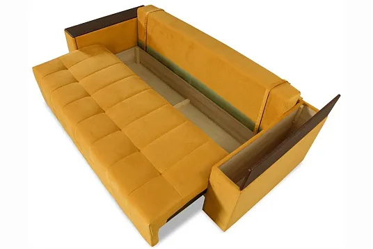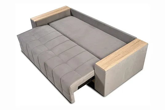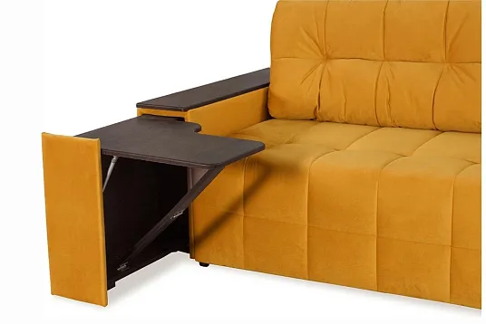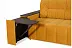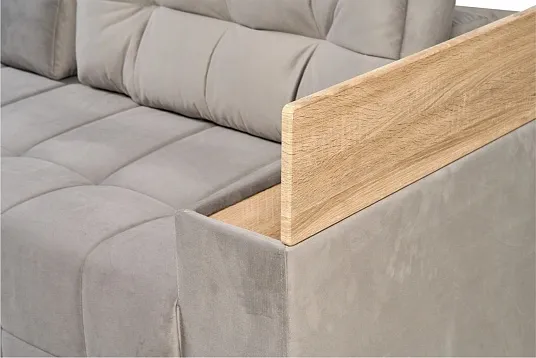 Модель отличается функциональностью благодаря продуманным решениям в подлокотниках: один оснащен выдвижным столиком с плавным механизмом закрывания, а второй оборудован практичным ламельным ящиком для хранения вещей.