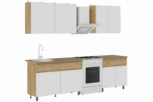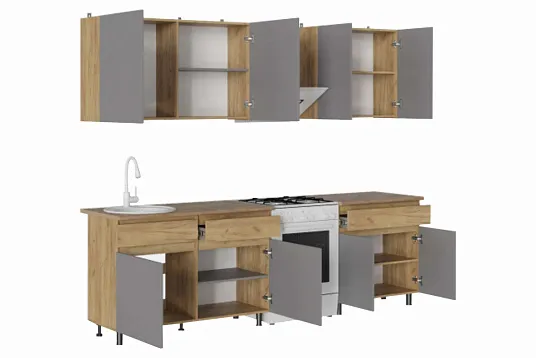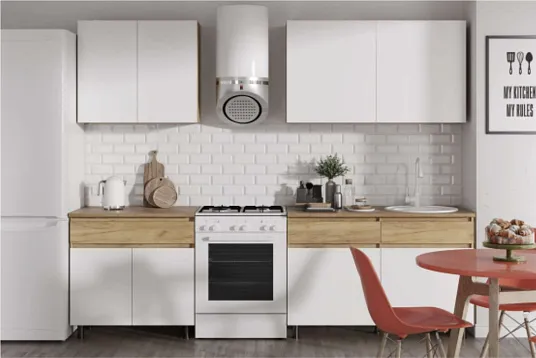Малогабаритная и функциональная кухня «Квик-Степ» выполнена в современном стиле с деревянной текстурой и матовыми фасадами, подходит для любого интерьера (скандинавский, минимализм, лофт). Кухня разработана с учётом потребностей пользователей, что делает их подходящими для небольших квартир и домов. Удобные ящики позволяют эффективно использовать каждый сантиметр пространства, обеспечивая при этом лёгкий доступ к необходимым предметам.