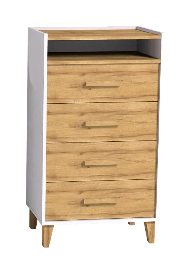 Айрис Комод высокий с нишей и вместительными ящиками на шариковых направляющих. Ящики выдерживают нагрузку до 10 кг каждый. Комод выполнен ил ЛДСП толщиной 16 мм в декорах Белый и дуб золотистый. Кромка ПВХ толщиной 2 мм защитит столешницу комода от повреждений, воздействия влаги и продлит срок его службы. На всех остальных деталям толщина кромки ПВХ 0,4 мм. Импровизированные бортики предотвращают падение предметов со столешницы. Максимальная нагрузка на столешницу до 25 кг. В верхней части комода открытая ниша, высота которой100 мм. Выдвижные ящики глубиной 370 мм оснащены шариковыми направляющими. Максимальнная нагрузка на дно ящика до 10 кг. Трапециевидная ручка-планка длиной 180 мм выполнена из массива дерева в тон фасадов. Опоры со скосом высотой 120 мм позволят беспрепятственно передвигаться роботу-пылесосу при уборке спальни. Для предотвращения опрокидывания комод обязательно нужно крепить к стене подвеской уголком, который устанавливается на нижнюю полку ниши.