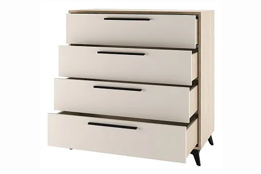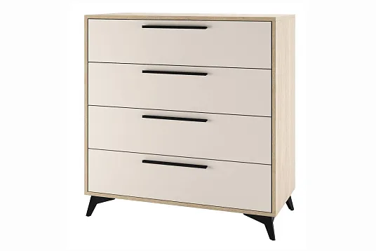 Современный дизайн подчеркивается элегантными черными металлическими ручками и устойчивыми ножками-опорами, которые не только обеспечивают надежность конструкции, но и создают гармоничный внешний вид. Корпус комода выполнен из качественного ЛДСП, гарантирующего долговечность и простоту в уходе.