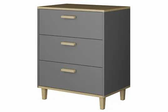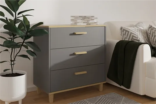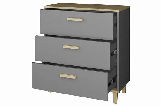 Конструктивные особенности включают три вместительных ящика с полновыкатными направляющими, которые обеспечивают плавный ход и удобство использования. Регулируемые ножки позволяют установить комод даже на неровном полу.