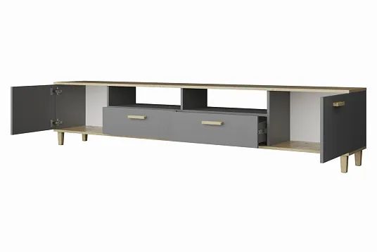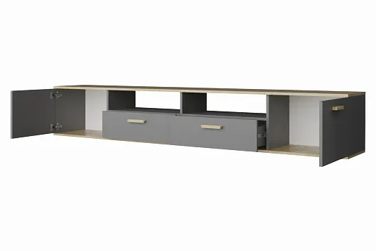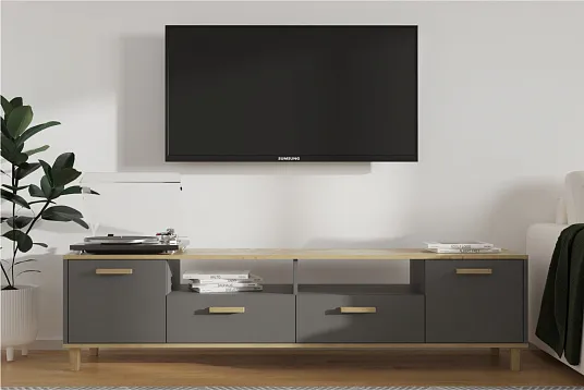 Благодаря своим размерам и стильному дизайну, тумба станет не только функциональным, но и декоративным элементом интерьера, идеально подходя для размещения телевизора и сопутствующих устройств.