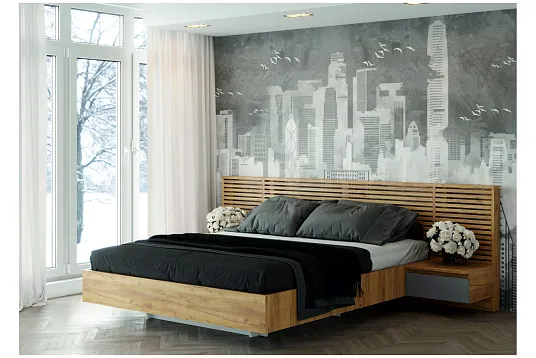 В комплекте также предусмотрена ниша для хранения вещей. Парящие тумбы без видимых крепёжных элементов и изголовье в стиле Баффели.
