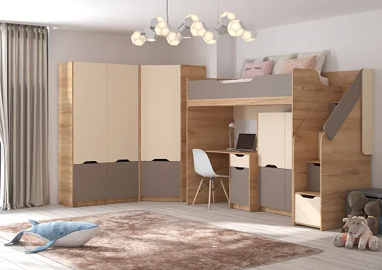 Модульная детская "Rich" славится богатым выбором модулей, что позволяет создать детскую комнату мечты для вашего ребенка. Оригинальные фасады с фрезерованными выемками, которые заменяют ручки. Для безопасности торцевые части кровати-чердака скруглены и облицованы кромкой толщиной 2 мм, а ступени лестницы усилены дополнительными крепежными уголками. Все выдвижные ящики гарнитура оборудованы надежными шариковыми направляющими.