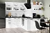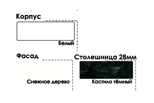 Цветовая гамма: Корпус — белый. Фасад — Снежное дерево (глянец/мат). Столешница — Кастило темный (толщина 2,8 см). Контрастные черные ручки.