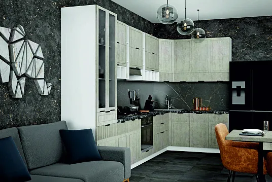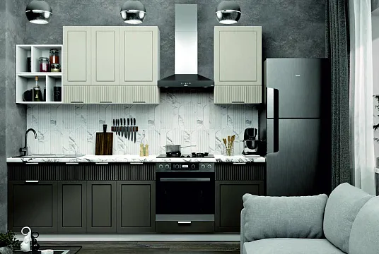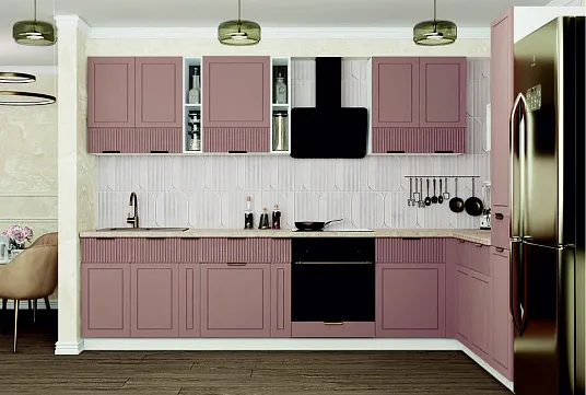 Серия кухонь Соната - это гармоничное сочетание классического французского шика и современных мебельных тенденций. Она отличается уникальной незаполненной фрезеровкой - рельефные фасады с минималистичными горизонтальными ручками в базовом черном цвете, а также глянцевых поверхностях хрома и золота, которые придают объем и глубину, сочетая их с легкими нотками градиента. Такая кухня идеально подойдет под любой вкус и стиль.