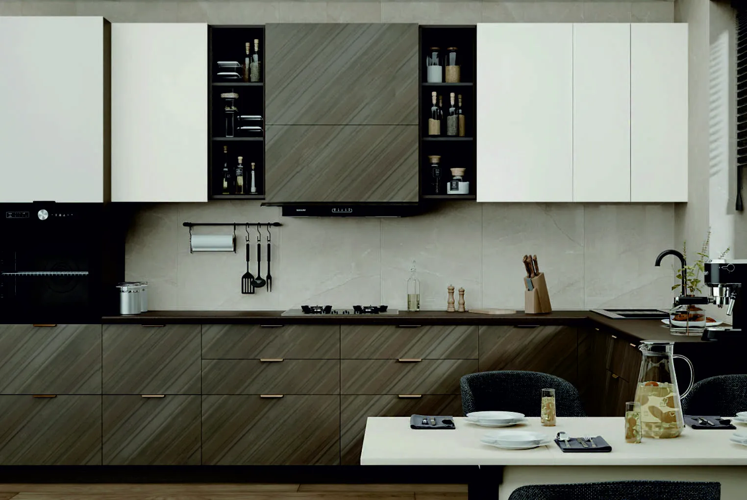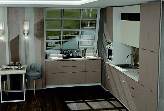 Кухня "Сюита" в стиле лофт - это идеальное сочетание индустриального шика и современного комфорта. Она выполнена в теплых оттенках, которые создают уютную атмосферу.