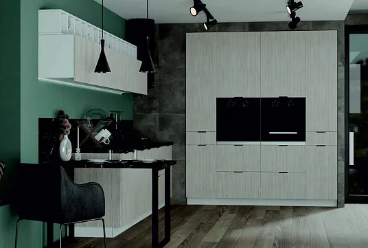 Фасады кухни имеют текстурированную поверхность, что придает ей особый характер и подчеркивает стиль лофт. Ручки выполнены в минималистичном стиле, что добавляет элегантности и современности.