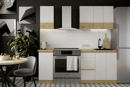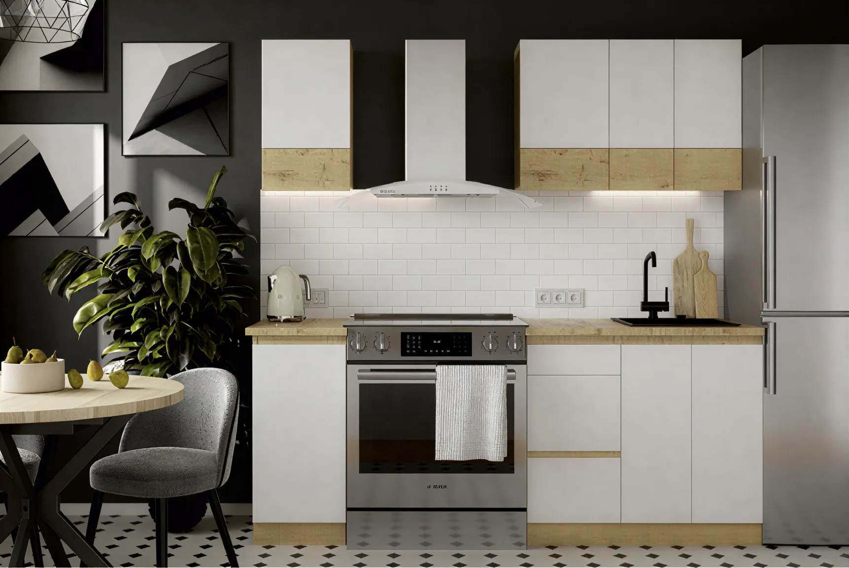 Выразительный дизайн: Контрастное сочетание матовых фасадов цвета «Базальт» или «Дуб Бунратти» с белым корпусом создаёт динамичный и стильный образ. Тёплая, фактурная столешница «Дуб Бунратти» толщиной 2,8 см добавляет интерьеру благородства и натуральности.