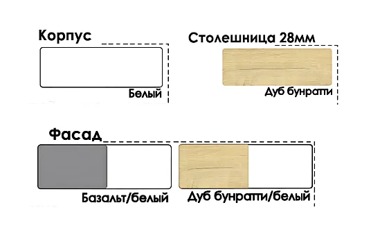 Цветовые решения: Корпус — белый. Фасад — Базальт/Белый или Дуб Бунратти/Белый. Столешница — Дуб Бунратти.