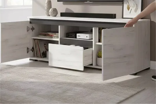 Светлая, современная гостиная "Гретта" отличается качественной фурнитурой, актуальной расцветкой. Модульная система дает возможность собрать гостиную мечты. Тумба ТВ "Гретта" 2-створчатая с ящиком на роликовых направляющих. Применение интегрированной ручки на фасадах делает модель стильной и безопасной – дверцы и ящик открываются за профилированные выступы. Фасады обработаны кромкой 1 мм.