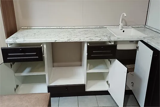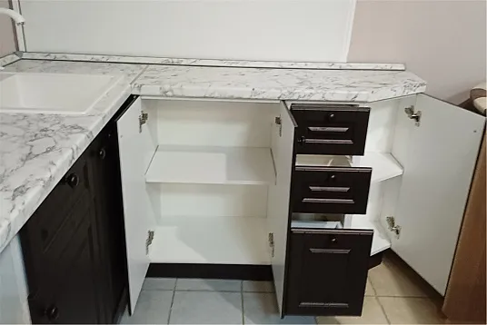 В стоимость входит: кухонные модули, столешница, плинтус, кромка, планка, заглушки.