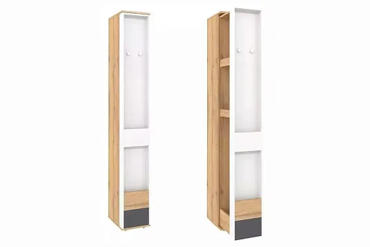 Нередко хобби ребенка перерастает в нечто большее и становится не только способом реализовать свои творческие способности, но и делом всей жизни. Уникальный выдвижной шкаф для хобби МЦН с двумя зонами хранения: внутренняя закрытая зона и фасадная часть с карманами. Внутри шкафа полки с ограничителями и ниша с крючками, где можно хранить форму для тренировок, мячи, ролики, наборы для творчества и другие аксессуары для хобби. Зона хранения на самом фасаде включает в себя: карман для высоких бумаг и ватманов, ручку, выполненную виде полочки, и два крючка, на которые удобно повесить заработанные медали, скакалки, элементы декора. Выдвижная система шкафа МЦН на роликах оснащена широкими шариковыми направляющими полного выдвижения.