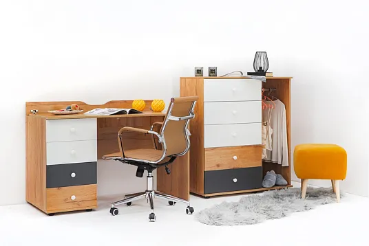 Все мамы знают, как непросто дается детям уборка и как, оказывается, «сложно» повесить в шкаф школьную форму и кофточку. Множество детских отговорок и как итог – испорченное настроение у обоих. Мы нашли компромиссное решение этой вечной проблемы: комод с рядом выдвижных ящиков и со стационарной штангой в нише без фасадов для хранения школьной формы или домашней одежды. Оригинальный комод с открытой нишей необходим в каждой детской для хорошего настроения.