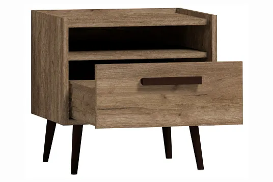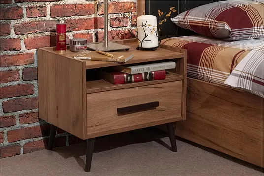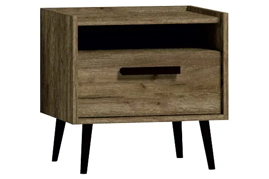 Элегантная и легкая тумба прикроватная с 1-им выдвижным ящиком станет прекрасным дополнением к Вашей спальне. Аккуратные черные опоры и ручки тумбы прикроватной выполнены из массива дерева. Они подчеркнут естественную красоту древесного декора и добавят мебели роскоши и «характера».