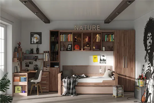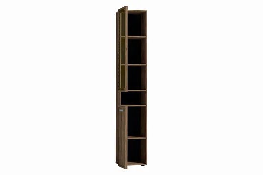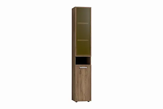 Высокий шкаф для хранения идеально подходит для комнаты подростков, в которой слишком много разнообразных и нужных вещей. Верхний рамочный фасад с тонированным стеклом открывается за раму, нижний фасад Контур открывается за серую ручку из массива. Верхний и нижний фасады можно повесить на левую и на правую стороны.