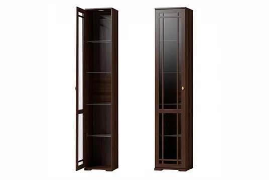Витрина в гостиной означает, что хозяева любят и ценят семейные традиции. В ней можно выставлять не только посуду, но и фотографии, совместно приобретенные сувениры, красивые интерьерные мелочи или детские поделки. На стеклянных полках толщиной 4 мм с еврокромкой можно разместить любые вещи весом до 10 кг. Встроенная подсветка поможет создать необходимую атмосферу и создать акценты для внимания гостей. Она оснащена трансформатором и подключается к бытовой электросети 220 В. Благодаря переплету из тонкого профиля МДФ дверь не перенавешивается на другую сторону.
