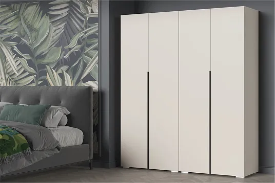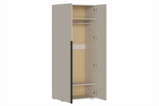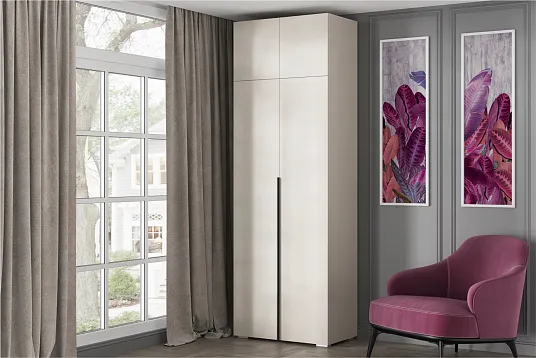 Двухстворчатый шкаф, разделённый на три функциональных отсека. Верхняя и нижняя ниши подходят для хранения сложенной одежды, коробок или аксессуаров. Центральный отсек оснащён прочной металлической штангой, которая способна выдержать до 15 кг одежды.