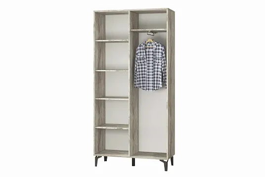 Шкаф «Милан» — это универсальное и стильное решение для вашей прихожей. Он прекрасно дополняет центральную секцию из той же коллекции. У шкафа два отделения: в первом есть выдвижная штанга для верхней одежды и удобная полка, а во втором — четыре полки для разных предметов одежды и аксессуаров. Чёрные регулируемые металлические опоры дополняют общий дизайн.