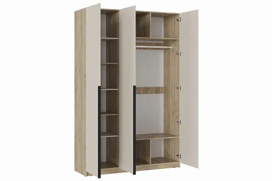 Шкаф разделён на две функциональные секции: левая секция с полками и правая секция со штангой.