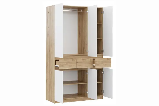 Шкаф ШК-003 Бостон Лайт — это продуманное решение для эффективного хранения вещей, объединяющее несколько функциональных зон: просторное отделение со штангой для одежды и верхнюю секцию с полками для сезонных вещей. В нижней части расположены практичные ящики — двойной и одинарный, дополненные удобными боковыми секциями с полками для мелких предметов. Конструкция отличается надёжностью благодаря использованию качественных материалов: задние стенки и дно ящиков выполнены из прочного набивного ЛХДФ. Безопасность эксплуатации обеспечивается комплектом навесов «уголок с накладками» для надёжного крепления к стене, а удобство использования достигается за счёт системы открывания ящиков и створок за фасад без ручек. Гибкая конфигурация шкафа позволяет адаптировать его под индивидуальные потребности благодаря возможности универсальной сборки.