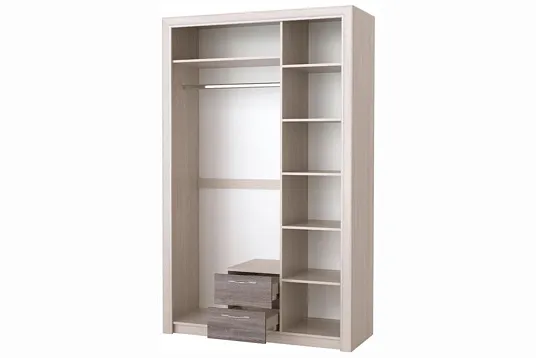 Шкаф 3С2Я «Октава» — это трёхдверный шкаф с ящиками, полками для белья и поперечной металлической штангой для верхней одежды. Он оснащён стильной металлической ручкой с декором «тёмный никель» и обрамлён профилем МДФ оригинальной формы с серебристой окраской фасок. В шкафу установлены шариковые направляющие полного выдвижения.