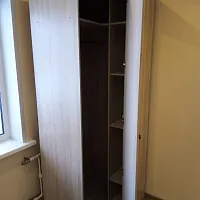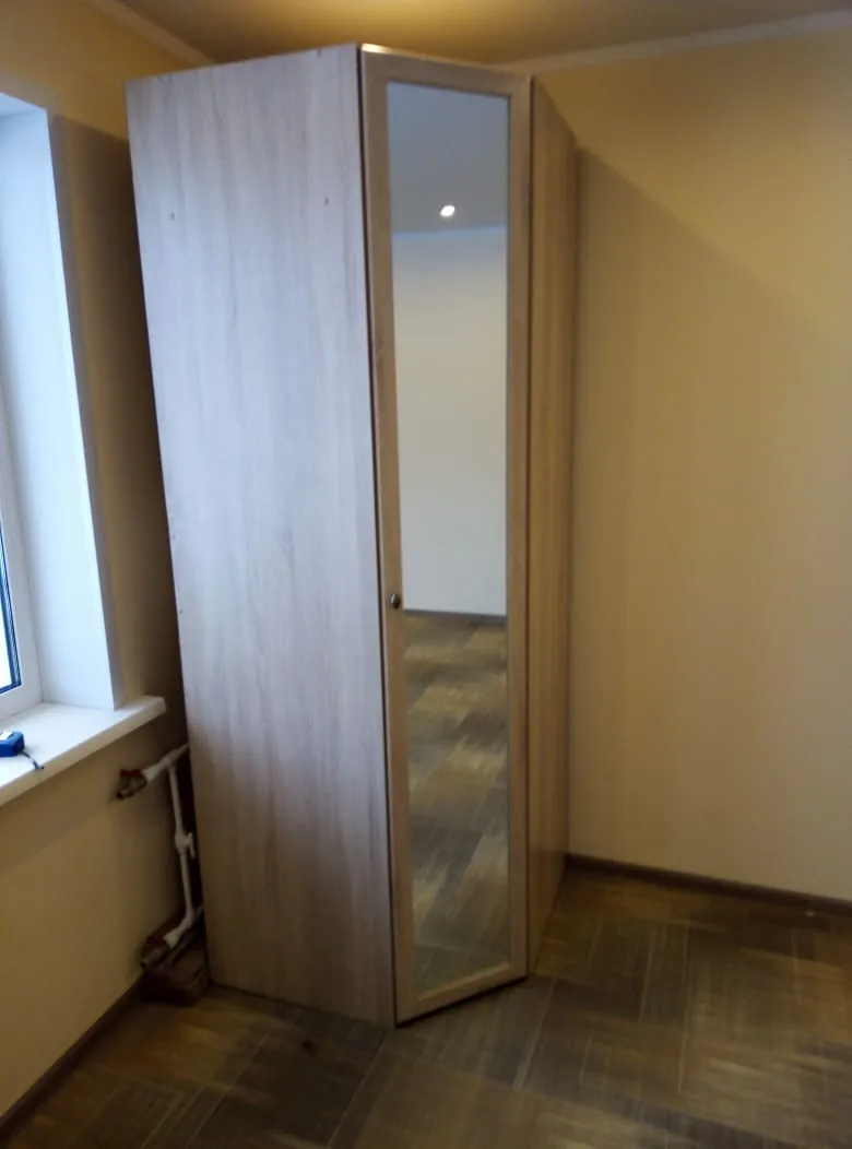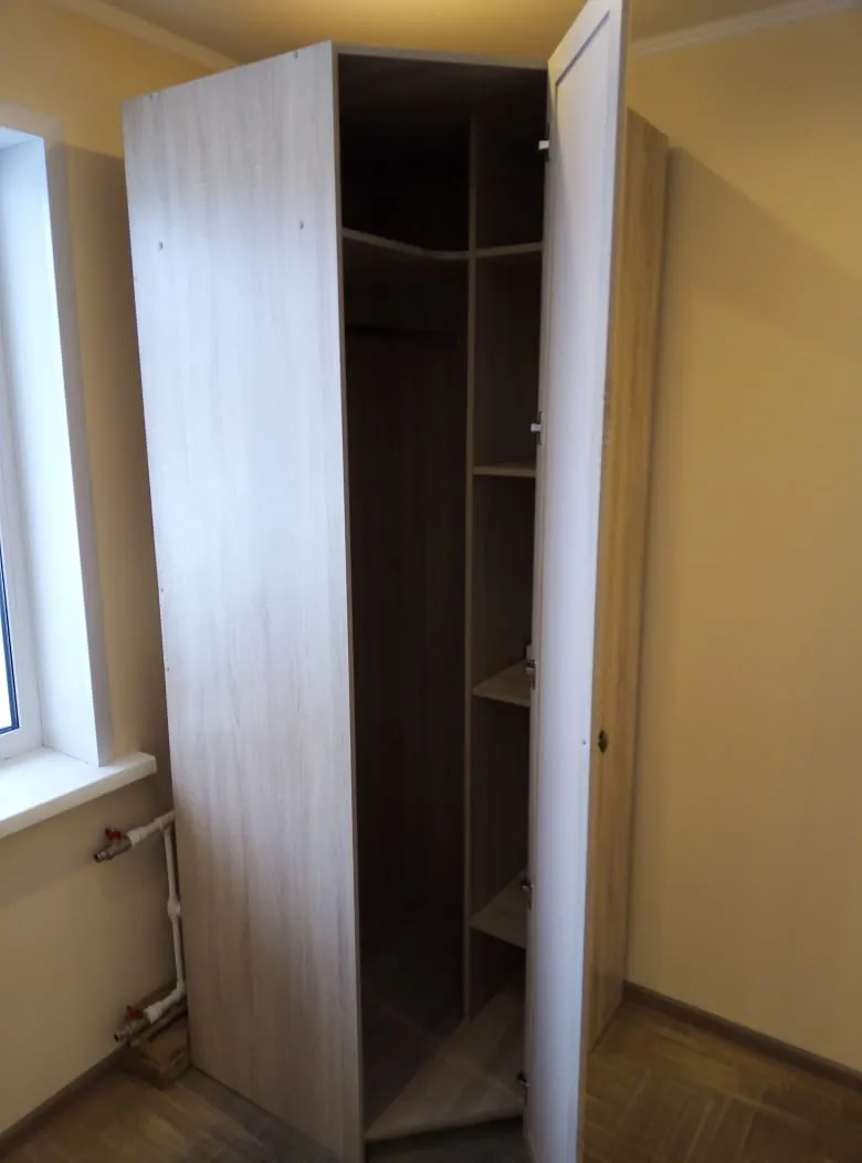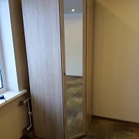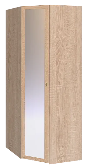 Угловой высокий шкаф использует рационально самую сложную площадь в комнате - угол. Он комплектуется внутренним стеллажом с регулируемыми по высоте полками и стационарной штангой для верхней одежды. Длина штанги 817 мм, что позволит свободно развесить более 10 плечиков с зимним гардеробом. Встроенная автоматическая подсветка поможет сориентироваться и быстро найти необходимое. Она включается только при открытой двери. Зеркальный фасад проклеен с тыльной стороны специальной пленкой, которая задержит падение осколков в том случае, если зеркало разобьется. Аккуратная рама из МДФ по периметру фасада не делит отражение и позволяет увидеть себя в полный рост без помех.