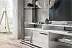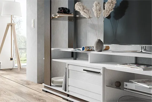 Для облегчения основного мебельного гарнитура в гостиной обратите внимание на стеллаж из коллекции «Модена». Его уникальная форма и конструкция помогут украсить комнату и разместить предметы декора: вазы, статуэтки, цветы, фоторамки и памятные вещи. Контраст полок из ЛДСП цвета «гикори рокфорд» со стеклом — изюминка этого модуля. Стеллаж хорошо сочетается с ТВ-тумбой и шкафами-пеналами «Модена».