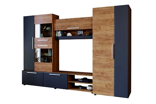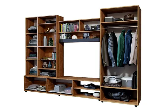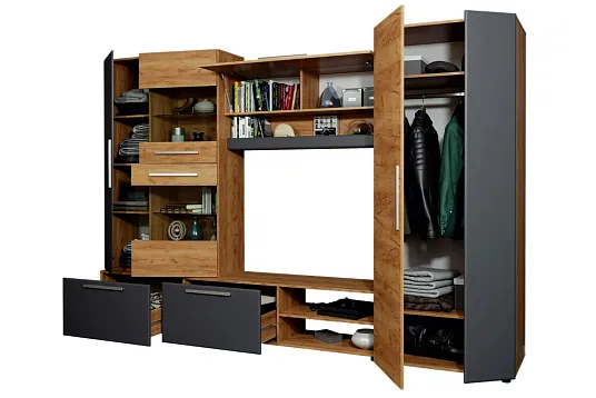 - Стенка обладает мультифункциональным наполнением и вместительными модулями.