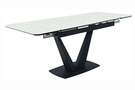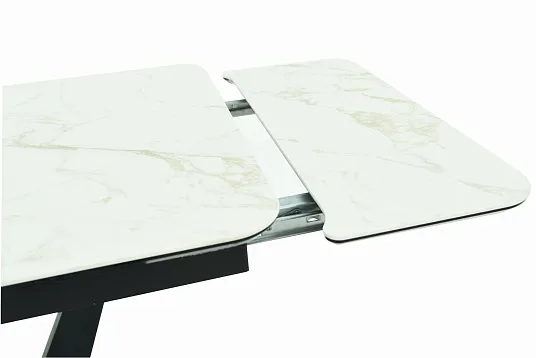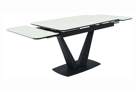 Обеденный стол с двумя торцевыми механизмами подъёма вставки имеет столешницу из МДФ, покрытую ПВХ-плёнкой, и керамическое покрытие.