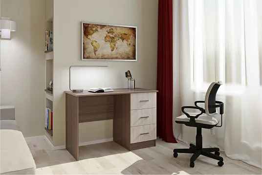 Современный компьютерный стол "ПКС-3" состоит из рабочей поверхности - столешницы и трех выдвижных ящиков. На столешнице можно с удобством разместить не только ноутбук, но и учебники, тетради, документы, канцелярские принадлежности. В выдвижных ящиках, установленных на роликовых направляющих неполного выдвижения (до 80%) также можно хранить вещи и материалы, необходимые для работы и учебы.