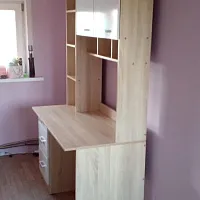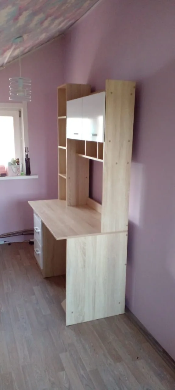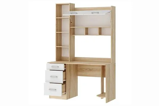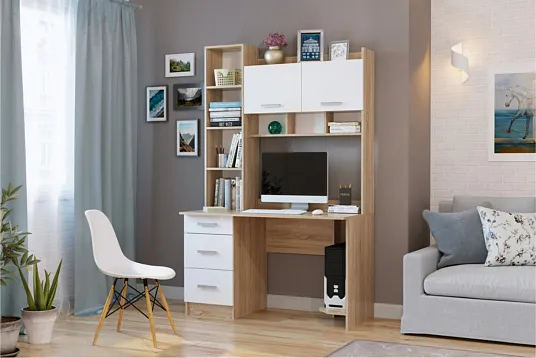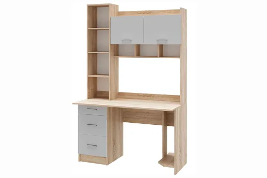 Компьютерный стол "ПКС-5" - эргономичный вариант для организации рабочего места школьнику или студенту. Стол в своей конструкции имеет стеллаж с открытыми полками, на которых всегда под рукой будут тетради и учебники. Тумба с тремя выдвижными ящиками на роликовых направляющих. Над столешницей предусмотрена надстройка с откидными дверками на газ-лифтах. Так же есть ниша для системного блока.